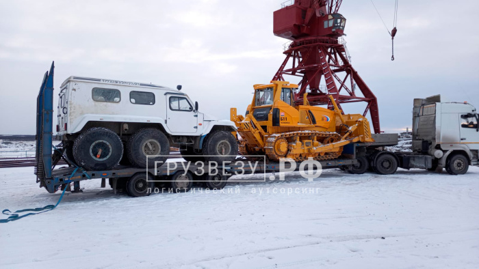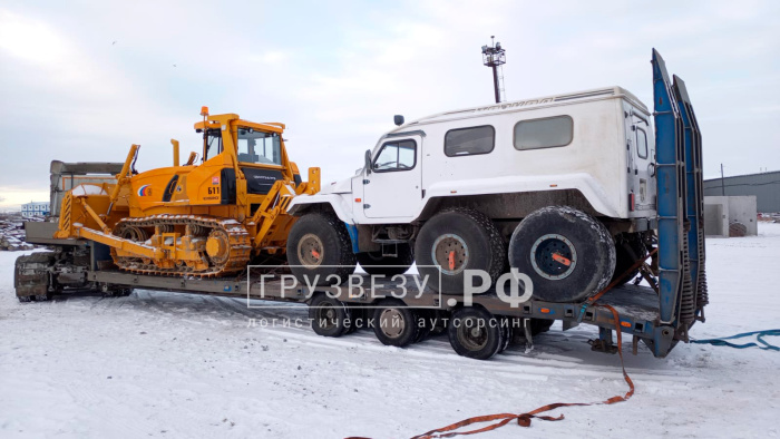 В октябре 2023 года наша компания осуществила перевозку вездехода трэкол, весом 3,5 тонны и бульдозера Четра Б11, весом 25 тонн из г. Лабытнанги в п. Вынгапуровский. Перевозимый груз включал в себя вездеходы Трэкол и бульдозер с отвалом и рыхлителем. Для выполнения данной задачи был выбран низкорамный трал что обеспечило надежную транспортировку груза по зимнику.
